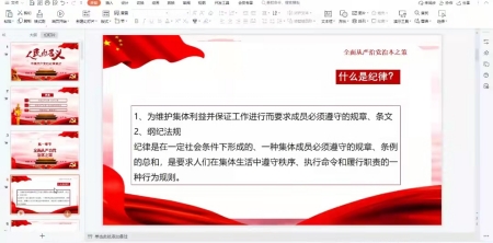 首先,雷丹老师向大家讲解了什么是纪律,并具体阐述了党的纪律的内涵。党的纪律建设主要可以分为六类:政治纪律、组织纪律、廉洁纪律、群众纪律、工作纪律、生活纪律。
