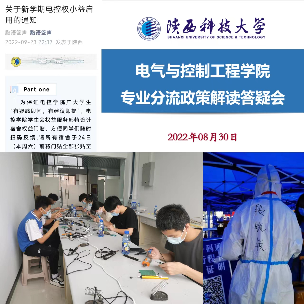 持续开展“我为师生办实事”实践活动,着力解决好师生的“急难愁盼”问题,不断提升师生的获得感、幸福感。一是扎实落实新生学业班主任制度、班级助理制度。为12个班级,383名新生配备高水平青年博士担任新生班主任、优秀学生担任班级助理,对大一新生开展为期一年的针对性教育引导,做好大学启蒙第一步。二是全力打造“全员科创”大学生科技创新平台建设。强化“全员科创学术委员会”职能,动员专任教师,联合企业专家,高频次开展创新竞赛技能培训,免费提供实验器材原件,全面开放学院实验场地,吸引学生400余人参与,完成创新作品200余件。三是坚持“三三三制”人才培养输出目标导向。通过开辟考研自习空间,共享搜集信息,策划考研模考,一对一报考规划,专任教师慰问帮扶等活动,助力考研学子圆梦;赴深圳、渭南、咸阳等地开展企业走访,新签订就业基地协议6家,为进一步提高毕业生的就业质量做好前期准备。