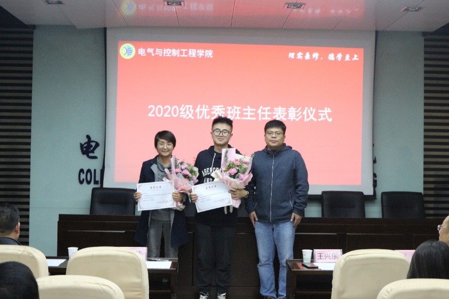 王兴东为受表彰的2020级本科生班主任雷凡、陈蓓两位老师颁发荣誉证书。