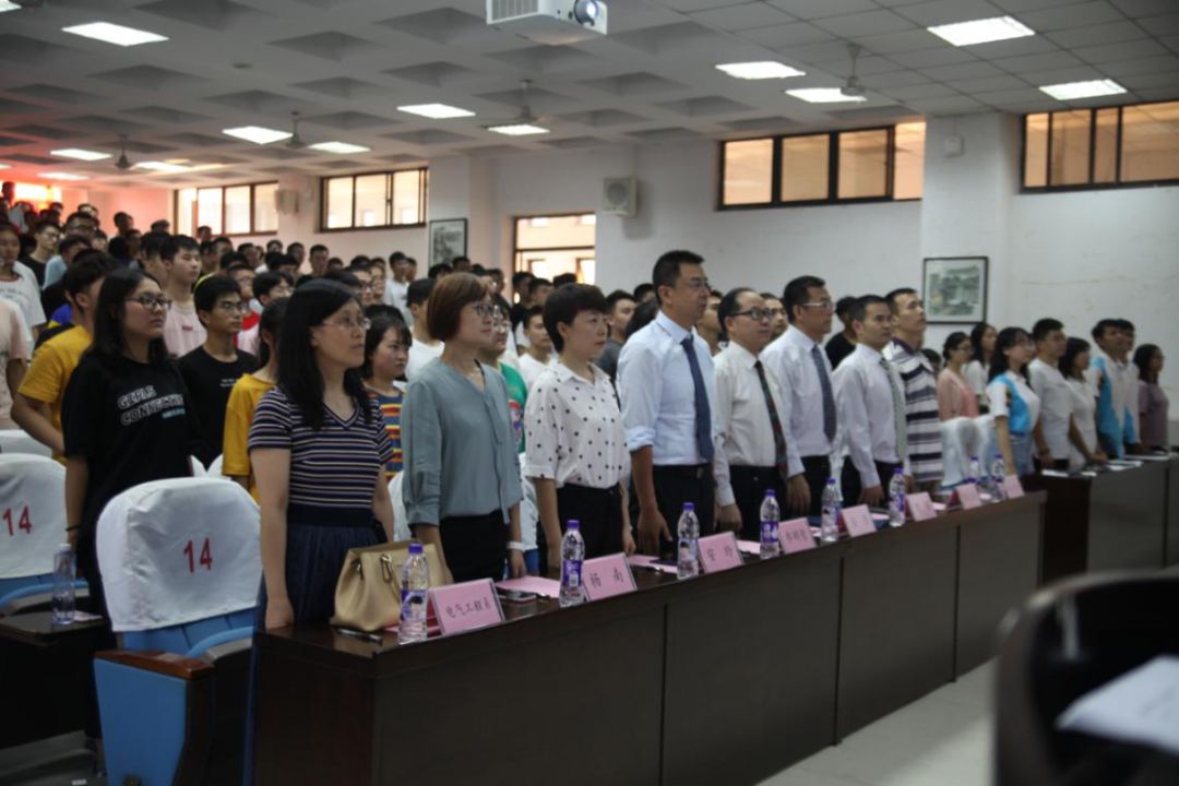 下午18:00,学院新生开学典礼暨军训动员大会于教三101举行。大会由任欢老师主持,学院党政领导、各专业教师代表、新生辅导员、班级助理以及2019级全体新生均到会参与。会上,汤伟副院长从什么是青年、我心中的大学、学院发展情况、给学生的话等方面进行了讲话,在最后以一首诗“小时候,父母在哪里,家就在哪里;求学时,母校在哪里,家就在哪里;工作后,事业在哪里,家就在哪里;成人后,家是最小国,国是千万家,有国才有家。”为新生指明了人生中应有的家国情怀和要坚持和努力的方向。