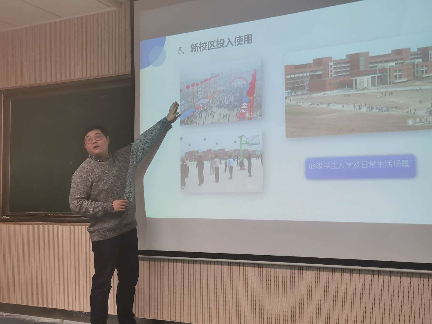 陕西科技大学时期:国家高等教育扩招,全校师生员工不等、不靠、不要,积极克服办学经费严重不足等困难,努力打破办学硬件条件不足等瓶颈问题,主体东迁至西安新校区,赵闯老师向大家展示了早期新校区投入使用时的景象,与现在的校区环境相比有非常大的差异,老师和同学们一起感慨陕西科技大学这些年来的美丽建设和巨大的发展进步。