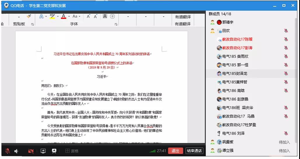 党日活动中由党支部副书记田欢同志领学了习近平总书记“在庆祝中华人民共和国成立70周年大会上的讲话”、“在庆祝中华人民共和国成立70周年招待会上的讲话”、“在国家勋章和国家荣誉称号颁授仪式上的讲话”。