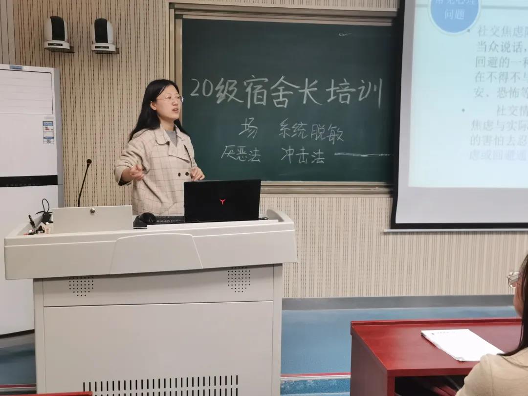 培训开始,任欢老师首先通过介绍宿舍长心理工作的职责和要求,让大家认识到了宿舍长的重要性。她强调宿舍长工作是最具体、最直接、最艰难的,需要同学们牢固树立公仆意识,心甘情愿地为同学服务,为同学奉献。