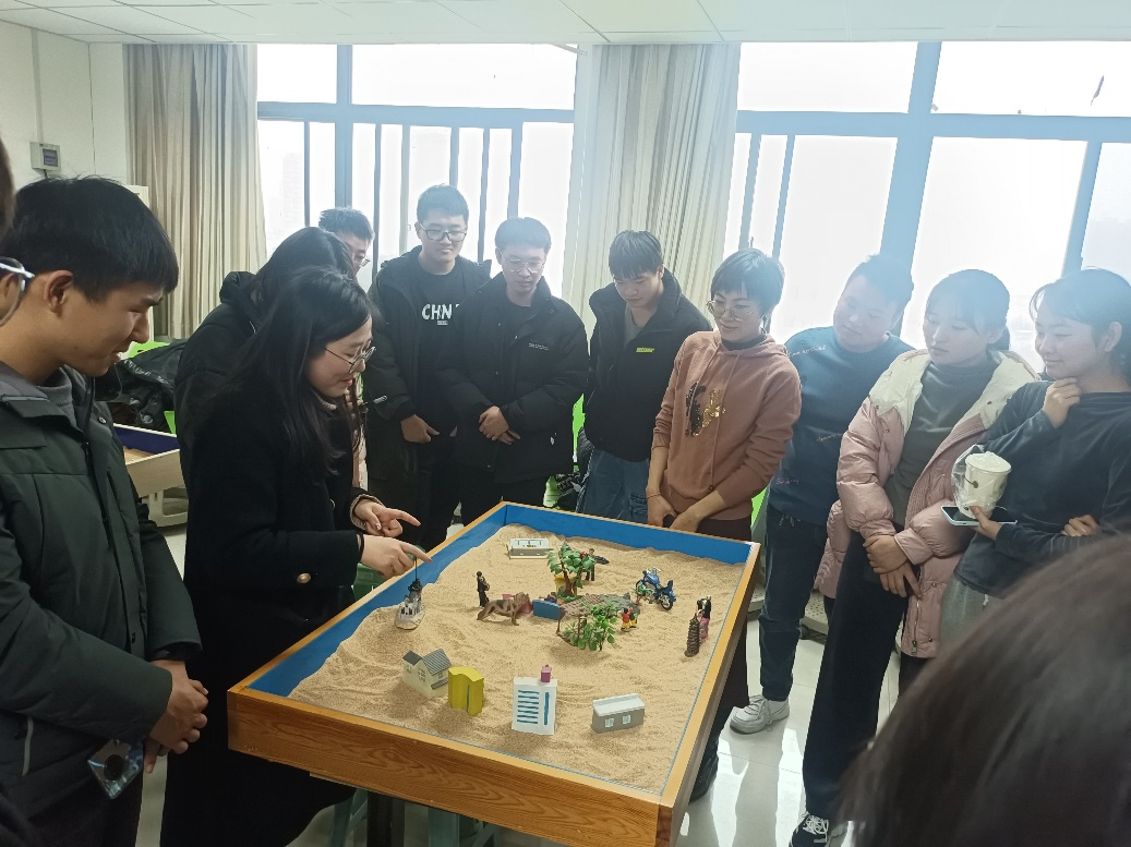在轻松、自由的氛围中,活动进行到第二阶段:团体沙盘。在这一阶段的过程中不能交流,每位同学每轮按照顺序从架子中选取想要在沙盘中摆放的模具,一共四轮,最后大家一起进行了小组分析,老师就各小组分享小组作品制作过程和感受来进行提问,来了解同学们每个动作背后的理由。在不交流的情况下,每个同学对于沙盘中物品的摆放都有不同的理解,间接影响着下一步的动作,这也可以看出交流沟通的重要性。