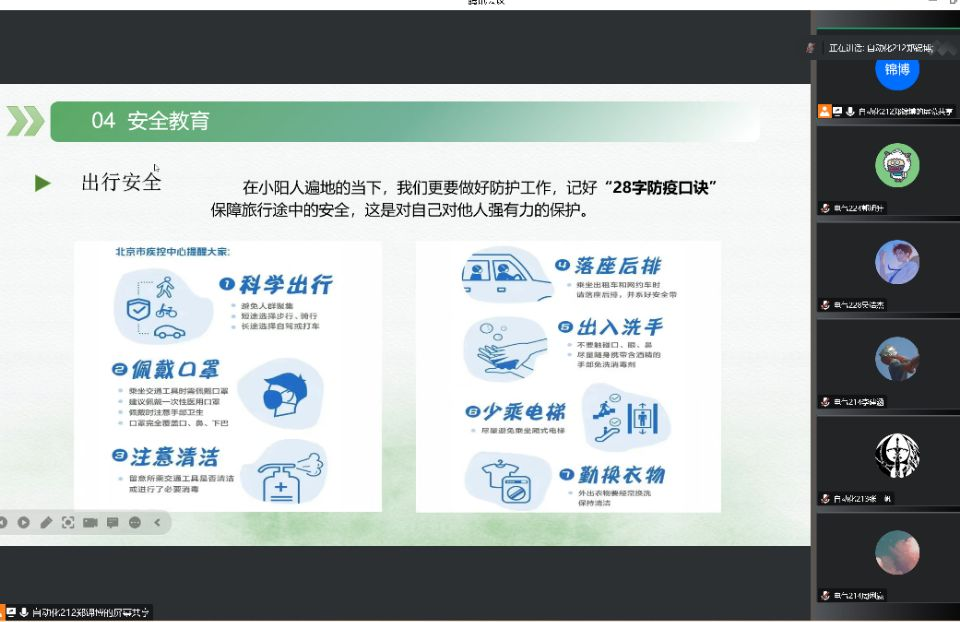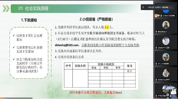 本次线上动员大会让同学们对寒假社会实践内容及实践安全问题有了更加清楚的了解和认识,激发了同学们参与实践的积极性并深刻了解到社会实践的意义;增强了同学们的安全防范意识;提高了同学们自我保护和预防事故的能力。最终,会议的顺利开展为寒假社会实践活动实施打下了良好基础。