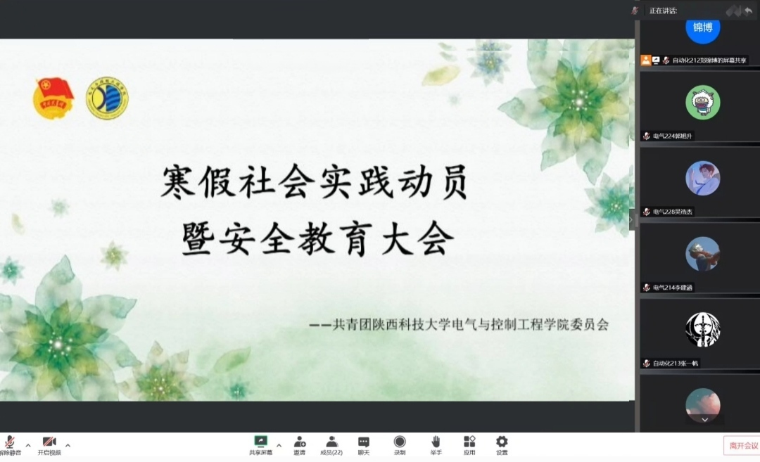 我院2023年“返家乡”寒假社会实践动员暨安全教育大会于2023年1月10日晚上七点以线上腾讯会议的形式顺利召开。学院团委实践部负责人及21、22级各支部团干参加了此次动员大会。