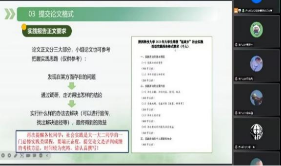 实践部负责人对本次寒假社会实践进行了动员,首先针对实践日记上传与课群的建立和完善进行说明。接着具体讲述了社会实践活动的多项内容,包括学党史、访母校、进基层、绘家乡等围绕党的二十大精神开展的一系列实践调研活动,对活动开展流程以及成果提交进行了具体要求。旨在通过返乡参与政务实践、公益服务、文化宣传等多种形式活动,提升社会化技能,增强服务人民、回报家乡的责任感和使命感。