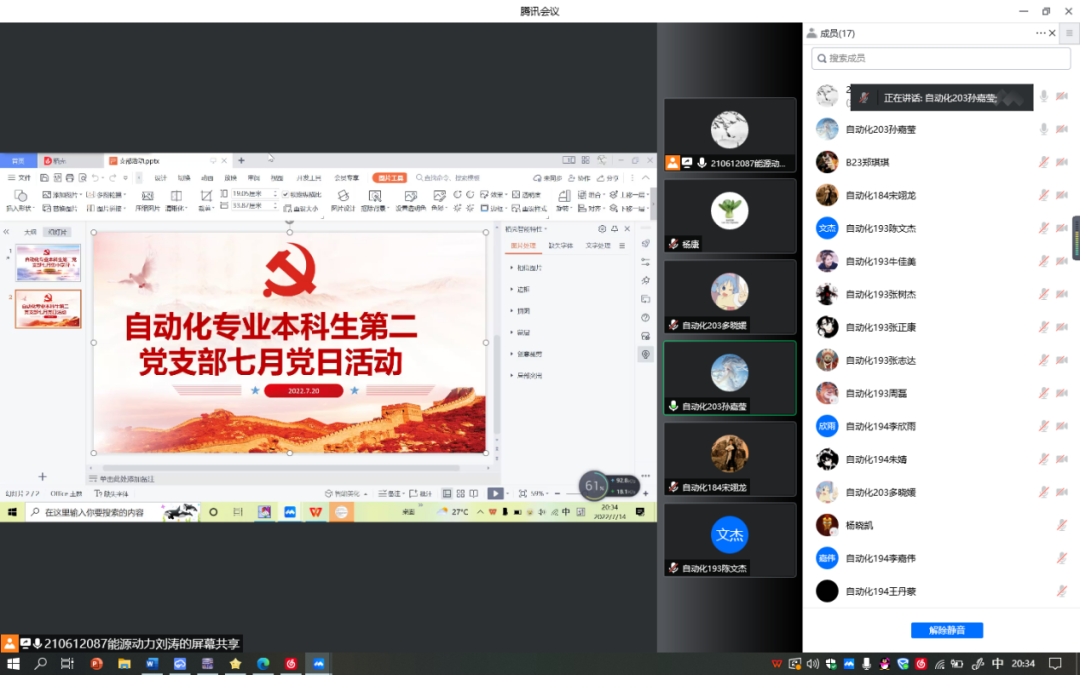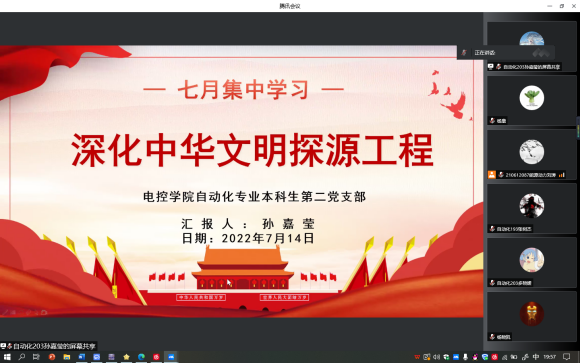 2022年7月14日晚19:40,自动化专业本科生第二党支部在线上开展集中学习。本次集中学习由支部副书记刘涛同志主持,多晓媛同志和孙嘉莹同志分别分享学习内容,支部全体党员同志参加。