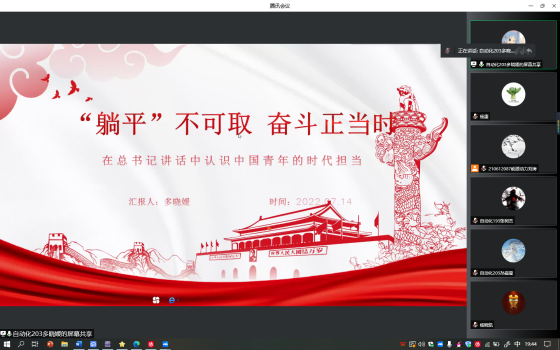 多晓媛同志结合网络热词“躺平”,对习近平总书记在中国共青团成立100周年上给青年的寄语进行分享。习近平总书记对中国青年寄予殷切期望:新时代的中国青年,生逢其时、重任在肩,施展才干的舞台无比广阔,实现梦想的前景无比光明,面临着人生无数出彩的机会。广大青年不应该原地“躺平”,而是怀揣理想,不断奋斗,党和国家的希望寄托在青年身上!