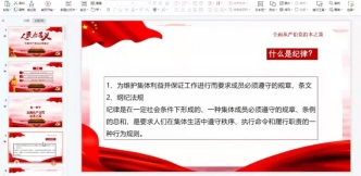 首先,雷丹老师向大家讲解了什么是纪律,并具体阐述了党的纪律的内涵。党的纪律建设主要可以分为六类:政治纪律、组织纪律、廉洁纪律、群众纪律、工作纪律、生活纪律。